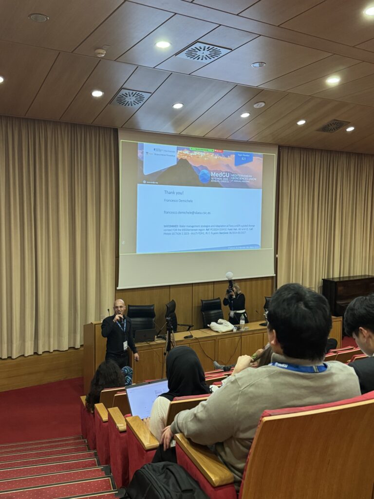 As part of the WATER4MED PRIMA Project, Francesco Demichele presented a cutting-edge methodology for identifying suitable areas for Managed Aquifer Recharge (MAR) within the Spanish demonstration site led by IDAEA-CSIC. His talk highlighted the resilience of the Besós River Basin and its ability to adapt to and recover from the impacts of climate change.