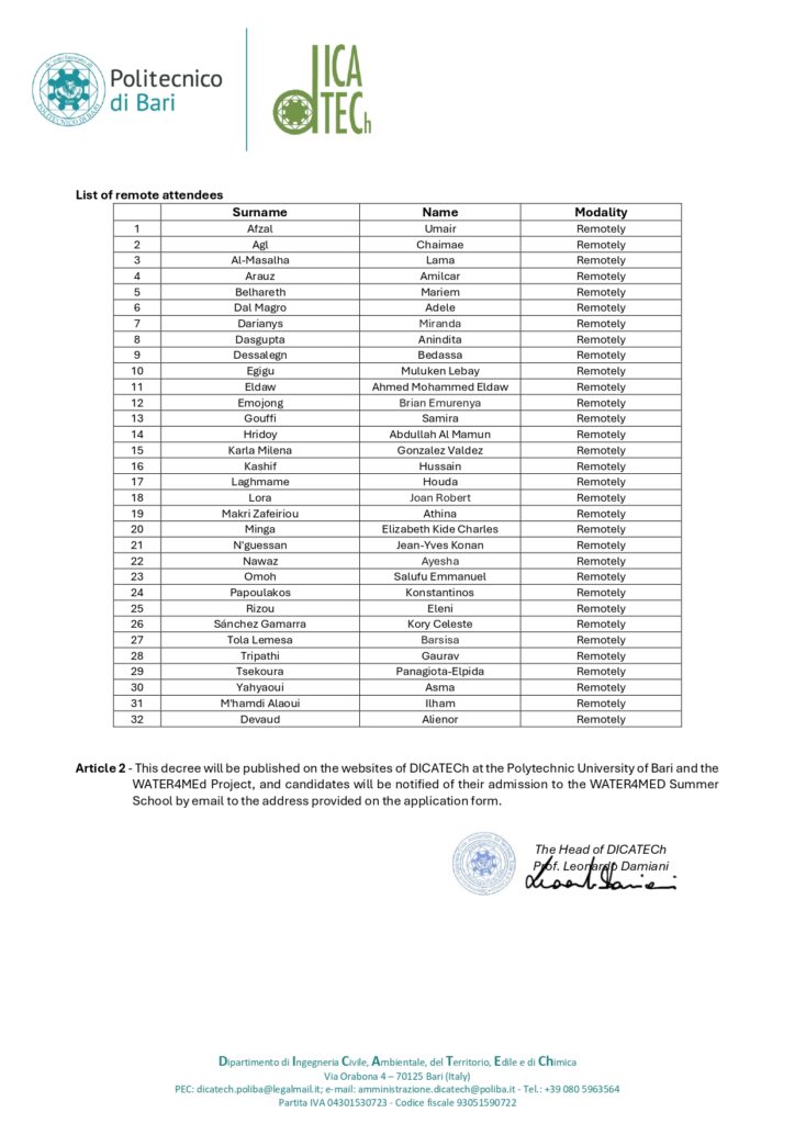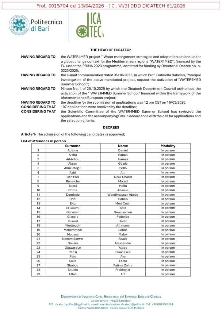 All admitted candidates will be notified directly via email at the address provided on their application form. The official decree detailing the full list of accepted names is now published on the DICATECH Politecnico di Bari website. The results decree is also available on the official WATER4MED project website. Congratulations to all the successful applicants